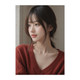 やさしい横顔と赤ニットのぬくもり