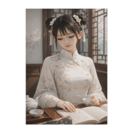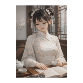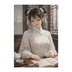 白花の書卓 ― 静謐なチャイナ服の女性