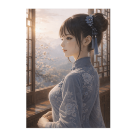 ポスター - B2この商品はpixivFACTORYで作られた商品です。サンプル画像は完成イメージのため、実物と異なる場合があります。 スモーキーブルーのチャイナ服を身にまとい、窓辺で静かに外を見つめる女性を描いたアートポスターです。 横顔の構図と柔らかな逆光が、詩的で穏やかな時間の流れを感じさせます。 落ち着いた青の色調が空間を引き締めつつ、知的で静謐な雰囲気を演出。 書斎や寝室など、静かな空間におすすめの一枚です。