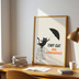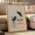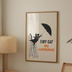 A minimalist wall art illustration featuring a tiny black cat standing bravely on a ladder, holding an umbrella with the message “Tiny Cat, Big Confidence.” This artwork represents courage, self-belief, and quiet confidence, even when you feel small.