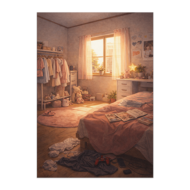 ポスター - B2この商品はpixivFACTORYで作られた商品です。サンプル画像は完成イメージのため、実物と異なる場合があります。 柔らかな色合いの部屋に、 観葉植物や洋服、小物たちが丁寧に配置された空間。 人の姿はなくても、 この部屋に暮らす誰かの性格や日常が 自然と想像できる一枚です。 穏やかな朝の光とともに描かれた、 生活の温度を感じるアートポスター。