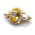 貴和クリスタルや真鍮パーツ、チェコガラスボタンなどのブローチです。 ⚠️尖った部分がありますので、お取り扱いにはご注意ください。 ⚠️人の多い場所へブローチを着けてお出かけの際は、周囲へのご配慮とともに、引っ掛かりなどに十分お気をつけください。 【ピンの付け方】 ① シリコンキャッチをいったん針から外します。 ② ピンの針をお洋服などに刺します。 ③ もう一度、針にシリコンキャッチを付けます。 ④ 最後に針をストッパーにしっかり取り付けます。 こうしておくと、万が一ストッパーが外れてもシリコンキャッチが残るので、落下を防ぐことができます。 【サイズ】 幅:約4.5センチ ※写真で見るより小さいと思います。