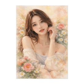 ポスター - B2この商品はpixivFACTORYで作られた商品です。サンプル画像は完成イメージのため、実物と異なる場合があります。 やわらかな水彩タッチで描かれた、花々に包まれた女性のポートレート。 淡い色彩と透明感のある表情が、静かで優しい空気を演出します。 お部屋に飾ることで、穏やかな時間を感じられる一枚です。