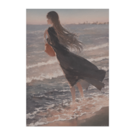 ポスター - B2この商品はpixivFACTORYで作られた商品です。サンプル画像は完成イメージのため、実物と異なる場合があります。 夕暮れの海辺と女性のシルエットを、水彩と油彩を思わせる柔らかな表現で描いたアート風ポスターです。風に揺れる髪や波のきらめきが印象的で、落ち着いた雰囲気の空間づくりにも適した作品です。