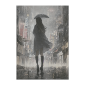 ポスター - B2この商品はpixivFACTORYで作られた商品です。サンプル画像は完成イメージのため、実物と異なる場合があります。 雨の夜の街並みと傘を差した女性のシルエットを、水彩と油彩が混ざり合うようなアート風タッチで表現したポスター作品です。にじむ光や路面の反射が印象的で、静かで幻想的な雰囲気を楽しめる一枚に仕上がっています。 インテリアアートや鑑賞用ポスターとしてもおすすめです。