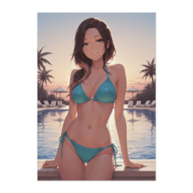 ポスター - B2この商品はpixivFACTORYで作られた商品です。サンプル画像は完成イメージのため、実物と異なる場合があります。 夕暮れのリゾートプールを背景にした爽やかな女性ポスターです。明るく開放的な雰囲気と透明感のある色彩が特徴で、夏のインテリアやアートコレクションにおすすめです。