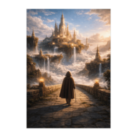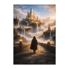 天空都市へ向かう旅人ポスター(幻想ファンタジー都市アート)