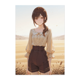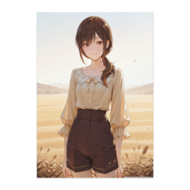 ポスター - B2この商品はpixivFACTORYで作られた商品です。サンプル画像は完成イメージのため、実物と異なる場合があります。 黄金色に輝く野原を背景に、 クラシカルなブラウスとショートパンツを合わせたナチュラルなスタイルを描いたポスター作品です。 あたたかな光に包まれた優しい微笑みが、 穏やかで上品な空間を演出します。 季節を問わず飾りやすい落ち着いた色合いの一枚です。