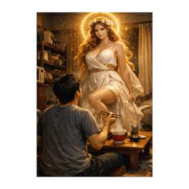 ポスター - B2この商品はpixivFACTORYで作られた商品です。サンプル画像は完成イメージのため、実物と異なる場合があります。 散らかったワンルームの部屋。 夜食のおにぎりを食べようとしていた男の前に、 突然現れたのは黄金の光をまとったヴィーナス。 神話の女神と日常の部屋。 静かな奇跡のような瞬間を描いた幻想的ポスター作品です。 温かい金色の光と柔らかなドレスの流れが、 現実と神話が交差する不思議な空間を作り出します。