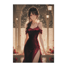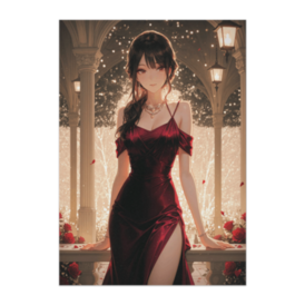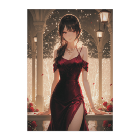 ポスター - B2この商品はpixivFACTORYで作られた商品です。サンプル画像は完成イメージのため、実物と異なる場合があります。 深いワインレッドのドレスを纏った女性が、幻想的なローズガーデンの光の中で佇む美しいアートポスターです。 上品なドレスの輝きと、背景の暖かな光が調和し、落ち着いた大人の雰囲気を演出しています。 エレガントでロマンチックなインテリアアートとして楽しめる一枚です。