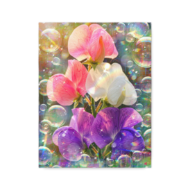 キャンバス - F6詩:瑞気満ちる虹の庭 Divine Familial Love 春の淡い陽が息づき シャボンはそっと 空へほどけ 輝く子らの 笑顔が踊る 時はそっと祝福し 家族は希望を祈る 瑞気満ちる虹の庭 Divine Familial Love -戎- Poetry. ”Divine Familial Love” Soft daylight breathes Soap bubbles drift upward into quiet sky Their shining faces dance in light Time blesses softly our quiet hope In the rainbowed garden Divine Familial Love -Kai- God bless you. 趣旨ーーーーーーーーーーーーーーーーーーーー ## 作品制作趣旨 作品は、春の朝の庭で、自分の娘達が楽しそうに談笑しながら庭に咲く明るく鮮やかな紫色、白色、ピンク色のスイートピーの花(Purple, white, and pink sweet pea flowers)の花を愛で、遊んでいる様子を思い出し描きました。 自分の娘たちが成長して行く様や、娘たちが希望に満ち溢れた笑顔で遊ぶ光景を、陽の光や虹色のプリズムで表現しています。 ## 解説 作者である私、戎(Kai)が、デジタル絵画「瑞気満ちる虹の庭 Divine Familial Love」とその対となる詩について、制作の意図を交えながら解説いたします。 ## 絵画「瑞気満ちる虹の庭 Divine Familial Love」の解説 **1. 全体的な印象** この作品は、春の光に包まれた庭で遊ぶ娘たちの記憶を、色彩と光の粒子によって再構築したものです。画面全体に広がる虹色のプリズムとシャボン玉は、子供たちの無邪気な笑顔が空間に溶け込み、多幸感に満ちた空気を生み出している様子を象徴しています。 **2. 色彩** 中心に据えられたスイートピーは、鮮やかな紫色、白色、ピンク色の三色で構成されています。背景にはパステル調の色彩を重ね、デジタルのグリッド模様や幾何学的なラインを配することで、有機的な花の美しさと無機的なデジタル表現を融合させています。 **3. 構図** 垂直に伸びるスイートピーを中央に配置した安定感のある構図です。その周囲を浮遊するシャボン玉が画面にリズムと動きを与え、観る者の視線を花から光の粒子へと導くように設計されています。 **4. 技法** 印象派的な筆致をデジタル上で再現し、層を重ねるレイヤー技法を用いています。光の反射や屈折を表現するために、透明度の異なる円形のエフェクトやシャープな直線を混在させ、複雑な光の干渉を視覚化しています。 **5. 表現力** 娘たちの成長への願いと、家族で過ごす平穏な時間を、単なる写実ではなく光の現象として表現しました。弾けるシャボン玉の一瞬の輝きは、子供時代の儚さと、その瞬間が永遠の喜びとして記憶に刻まれる尊さを物語っています。 **6. 美術的価値** 自然界の美しさを最新のデジタル技術で解釈し、精神的な祈りを込めた現代的な宗教画としての側面を持っています。抽象的な光の要素と具体的な花の描写が共存することで、観る者に深い安らぎを提供します。 **7. 作品に込められた想い** 春の朝、庭で楽しそうに笑う娘たちの姿は、私にとって最も尊い風景です。彼女たちが歩む未来が、この絵のように明るい希望と光に満ちたものであってほしいという、父親としての切実な祈りを込めています。 **8. 作品の鑑賞方法** まずは画面中央の花の色彩を楽しみ、次に周囲を舞う光の粒子やシャボン玉に注目してください。細部に見えるデジタルの質感を感じながら、春の温かな風と娘たちの笑い声を想像していただくのが理想的です。 **9. 作品の価値** 個人的な家族の思い出が、光や希望という普遍的なテーマへと昇華されている点に本作品の価値があります。時代が変わっても変わることのない家族の絆を、現代の表現手法で定着させています。 ## 詩「瑞気満ちる虹の庭 Divine Familial Love」の解説 **1. 全体的な印象** この詩は、マリー・ハウのように日常の断片を静かに見つめ、その背後に潜む神聖な気配を言葉にしています。短く区切られた一節一節が、呼吸を整えるように静かに心に響きます。 **2. 韻律** 日本語と英語の対比によって構成されており、どちらも五語以内の短いフレーズでリズムを作っています。削ぎ落とされた言葉の連なりが、絵画の中に舞うシャボン玉のように軽やかな響きを生み出しています。 **3. 修辞** 春の陽光を息づきという動詞で表現し、シャボン玉がほどけという言葉で消えていく様を描くことで、形のない感情や時間を視覚化しています。直接的な表現を避け、余白を感じさせる叙情的な言葉を選んでいます。 **4. 技法** 最小限の言葉で情景を喚起するミニマリズムの技法を用いています。日本語の情緒的な響きと、英語の精神的な重みを持つ単語を使い分けることで、作品の世界観を重層的に広げています。 **5. 表現力** 娘たちの笑顔を踊ると表現することで、生命の躍動感を伝えています。また、時間が祝福し家族が祈るという構成によって、家庭という場が聖なる空間であることを強調しています。 **6. 文学的価値** 家族愛という普遍的なテーマを、現代的な詩の形式で描き出しています。静寂と平和を根底に置きながらも、未来への強い希望を感じさせるドラマチックな展開を持っています。 **7. 作